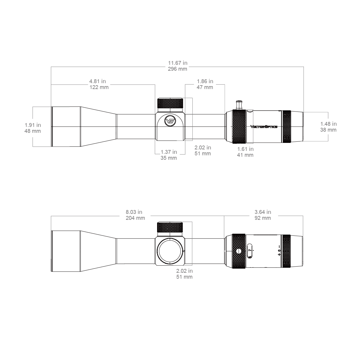 Dette rifleskopet har en hovedrørdiameter på 30 mm og en total diameter på objektivkoppen på 40 mm.