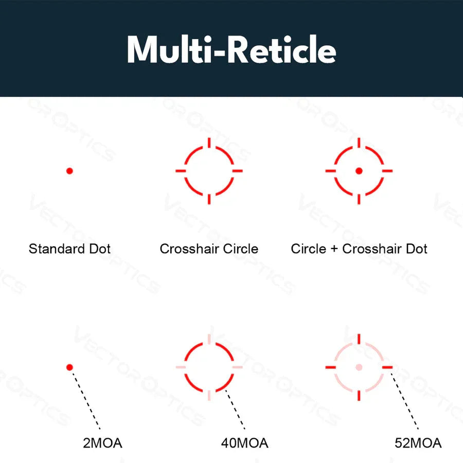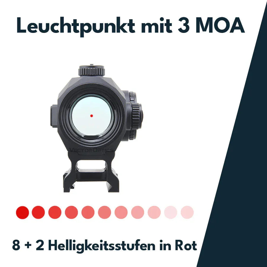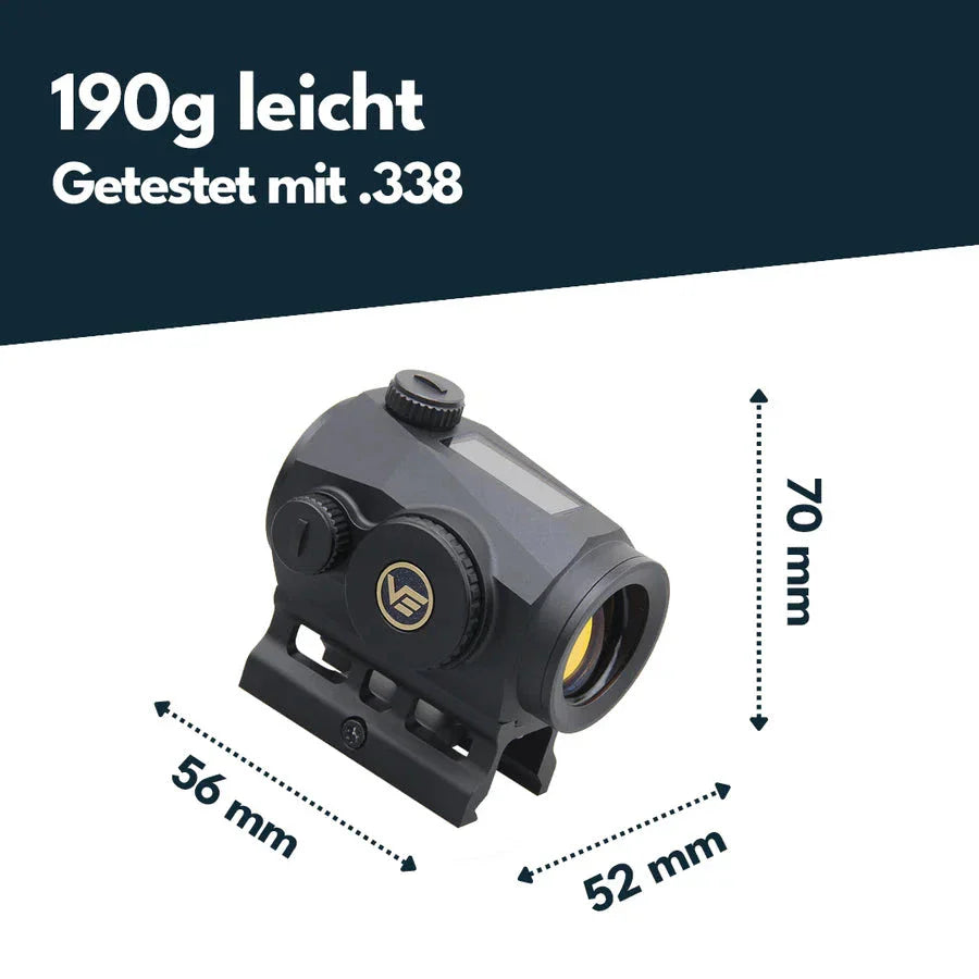 Den tilbyr også tre valgbare retikkelalternativer, en bevegelsessensor (automatisk avstenging etter 2 minutters inaktivitet, og den slår seg på igjen så snart optikken beveges), og totalt ti lysstyrkenivåer (inkludert 2 nattsynsnivåer).